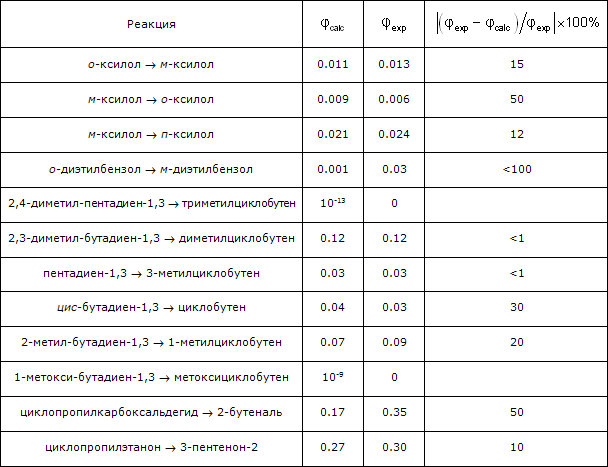 2.1. Исследована возможность построения полуэмпирического метода моделирования фотохимических процессов и расчета квантовых выходов реакций. Предложен полуэмпирический подход, опирающийся на основные физические принципы и адекватный логике построения всех работоспособных физических теорий в спектроскопии и квантовой химии. Результаты выполненных расчетов фотоизомеризации ряда молекул (12 реакций) показали работоспособность развиваемого метода – обеспечивается количественное прогнозирование квантовых выходов реакций на хорошем уровне согласия с имеющимися экспериментальными данными. Для реально наблюдаемых реакций с квантовыми выходами в пределах 0.01–1 отклонение прогнозируемых значений от экспериментальных составило 10–50 %. В тех случаях, когда по экспериментальным данным реакции не идут, рассчитанные значения квантовых выходов пренебрежимо малы – менее 10-9. Количественно верно предсказывается и соотношение величин квантовых выходов рассмотренных фотопревращений молекул, включая и случай аналогичных фотохимических процессов с качественно (на порядки величин) различающимися значениями квантовых выходов. Установлено, что при выполнении условия относительной малости вероятностей оптических переходов по сравнению с частотой квантовых биений количественные оценки квантовых выходов с удовлетворительной степенью точности могут быть получены непосредственно по величинам вероятностей переходов без проведения полного расчета кинетики фотопревращения. Выявлена причина наблюдающегося в эксперименте существенного различия квантовых выходов однотипных реакций для ряда молекул, при разных заместителях – изменение форм колебаний и/или изменение величины структурной перестройки, когда заместитель непосредственно в ней участвует. Показана высокая чувствительность интегральных характеристик фотохимических реакций (квантовых выходов) к конформации участвующих в процессе молекул.